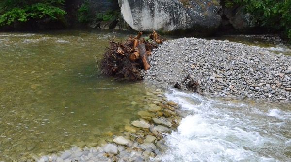 Wurzelstämme, Steine, Kies und Totholz